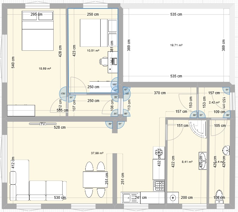 Razporeditev prostorov je funkcionalna. Iz hodnika je dostop do ločenega WC-ja, kopalnice, kuhinje, dnevnega prostora z jedilnico ter velike sobe, ki jo je po dogovoru mogoče predelati v dve manjši. S tem bi stanovanje postalo 3-sobno. Ureditev v dve sobi se lahko izvede pred prodajo. Stanovanju pripada še klet v izmeri 8,5 m².